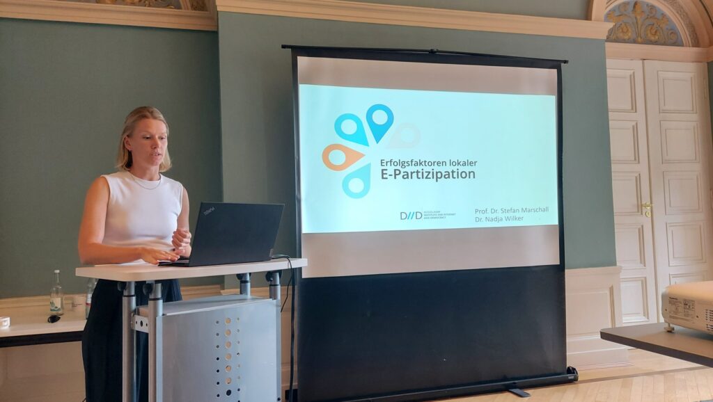 Ende Juni präsentierte Dr. Nadja Wilker beim Sommer-Retreat des Düsseldorfer Instituts für Internet und Demokratie (DIID) erste vorläufige Ergebnisse aus dem Forschungsprojekt „Erfolgsfaktoren lokaler E-Partizipation“ (Erle). Im Fokus des Vortrags stand die Vollerhebung aller Städte und Gemeinden in Deutschland, um deren Erfahrungen und Rahmenbedingungen bei digitaler Bürgerbeteiligung zu erfassen.